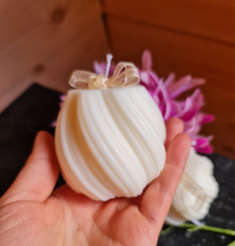 Twee Handgemaakte kaarsen in een leuke bollige vorm. Ze ruiken lekker en elegant.