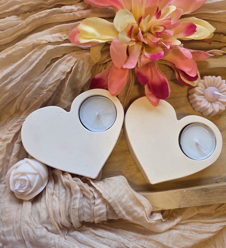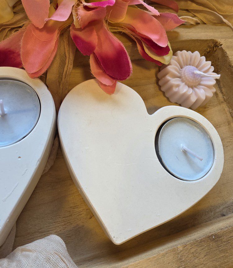 Handgemaakt waxinelichtje houder van gips. Ze zijn stevig en liggen goed op een oppervlakte. 2 kaarsjes komen meet de houders.