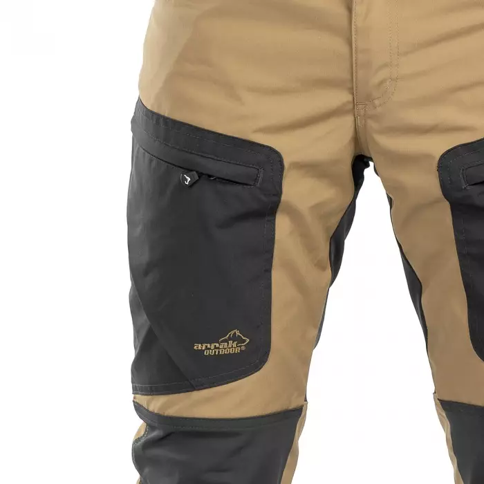 Arrak NEW Active Stretch Pants Men Khaki zijn onze meest populaire broeken! Op de knieën, knievouwen en aan de onderkant zijn 4-way stretch panelen wat de broek extreem flexibel maakt. Aan de onderkant is de broek verstevigd en voorzien van verstelbare beenuiteinden en een laarshaak, zodat hij perfect om de laars past. Op beide dijen zijn ventilatiegaten te openen met daarachter mesh voor perfecte ventilatie. De broek is voorzien van 5 zakken. Een aan de achterkant met ritssluiting, twee beenzakken en twee dijbeenzakken met ritssluiting.