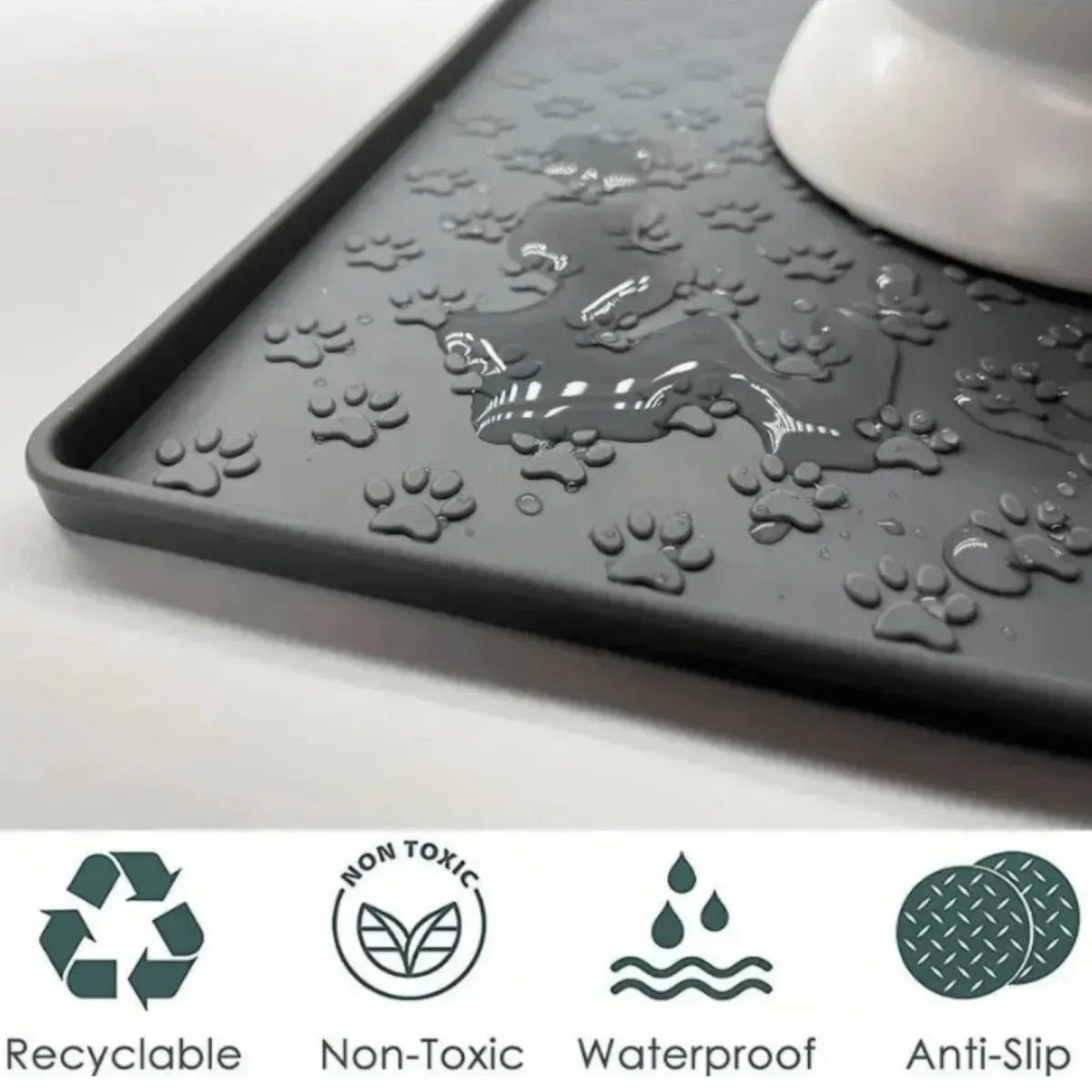 De EetPlek is gemaakt van hoogwaardig, duurzaam siliconenmateriaal dat volledig waterdicht en opvouwbaar is. De mat heeft een speciale anti-overflow rand die gemorst water en voer netjes opvangt, zodat je vloer altijd droog en schoon blijft. Dankzij de super friction-laag en het dikke, antislip oppervlak blijven voer- en drinkbakken stevig op hun plek staan, zelfs bij enthousiaste eters.