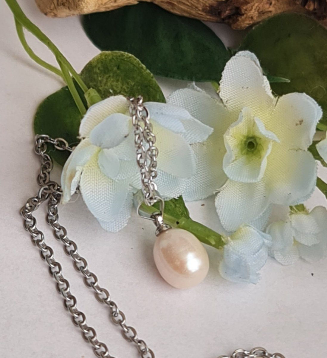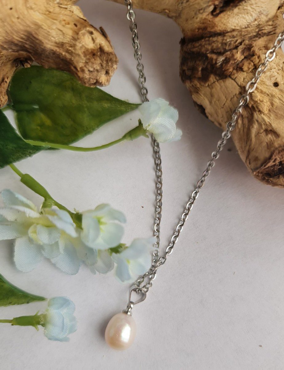 Handgemaakte ketting met een parel hanger in WIT kleur. De ketting is van zilver kleur, staal. De ketting is 20cm breed