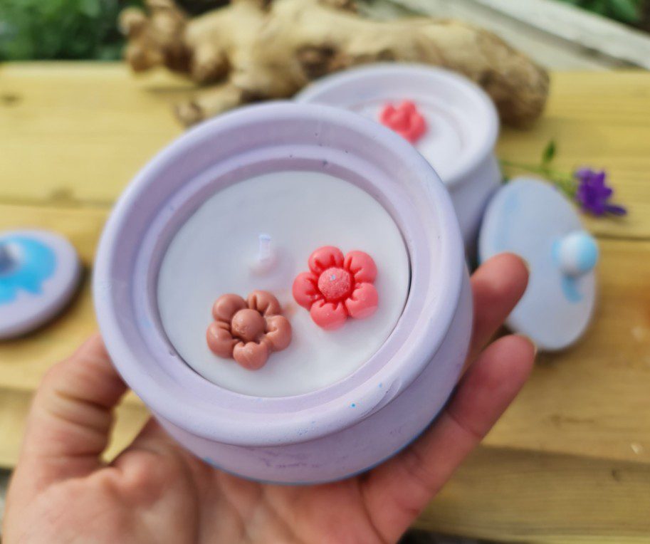 Met leuke decoratie boven kant met extra bloemetjes. Een mooi kaars voor warme nachten. De pot kan daarna gebruikt worden als een decoratie