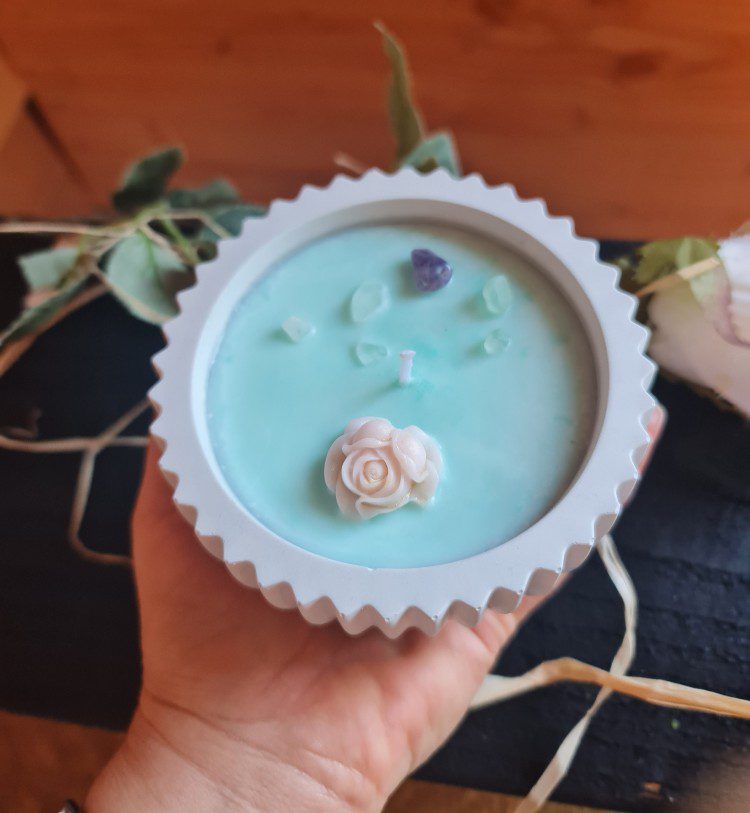 Handgemaakte kaars van ecologische soja wax. De poten hebben we zelf gemaakt van gips. De kaars is is in een natuurlijke kleur pot met gouden strepen. De wax is in licht beige kleur met prachtige edelsteen chips van groen Flouride en Amethist. Ook is een leuke kleine roosje er op