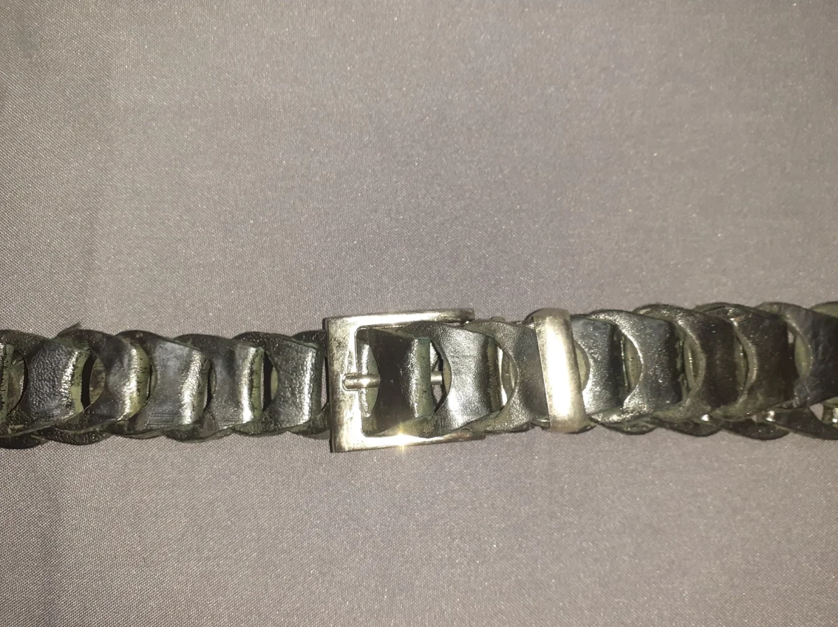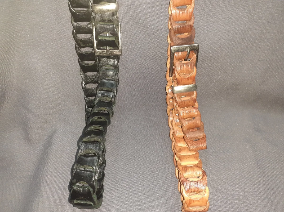 Unisex leren riem met gespsluiting, uniseks. Het is een lange katapultriem die uit het mannetje van de riem is gesneden om deze op maat te maken. Het wordt gebruikt voor jeans.
