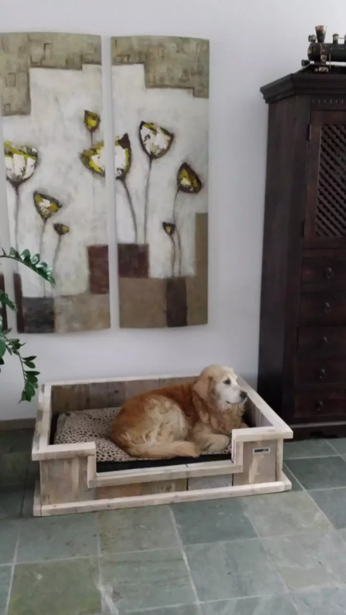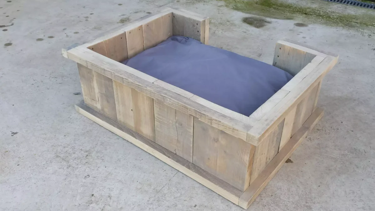 Het natuurlijke karakter van het hout zorgt ervoor dat elke mand een unieke uitstraling heeft. Kleine variaties in kleur en structuur geven de Hondenmand Luxe steigerhout een authentieke en warme look.