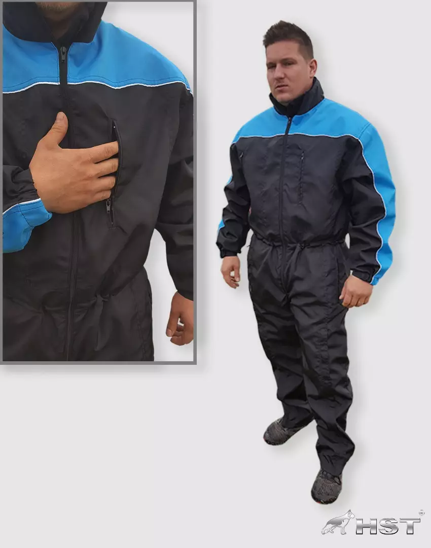 Zeer praktische overall, die het grootste deel van het jaar tijdens de training wordt gebruikt, maar vooral bij slecht weer, wanneer het de persoonlijke kleding van de handler perfect beschermt tegen vuil worden. De broek heeft ritssluitingen van de onderkant tot de knieën, voor gemakkelijk aan- en uittrekken, zelfs bij schoenen aan de voeten. De overall heeft twee onderste en twee bovenste ritszakken. Het is licht versierd met afsnijdsels van optionele kleuren op de mouwen en zadels met het Hubble-logo