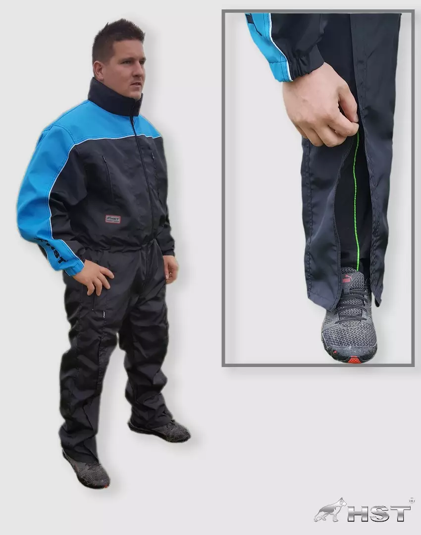 HST Winteroverall in diverse kleuren Unisex. Zeer praktische winter overall, die het grootste deel van het jaar tijdens de training wordt gebruikt, maar vooral bij slecht weer, wanneer het de persoonlijke kleding van de hondengeleider perfect beschermt tegen vuil worden. De broek heeft ritssluitingen van de onderkant tot de knieën, voor gemakkelijk aan- en uittrekken, zelfs bij schoenen aan de voeten. De overall heeft twee onderste en twee bovenste ritszakken. Het is licht versierd met afsnijdsels van optionele kleuren op de mouwen en zadels met het Hubble-logo.