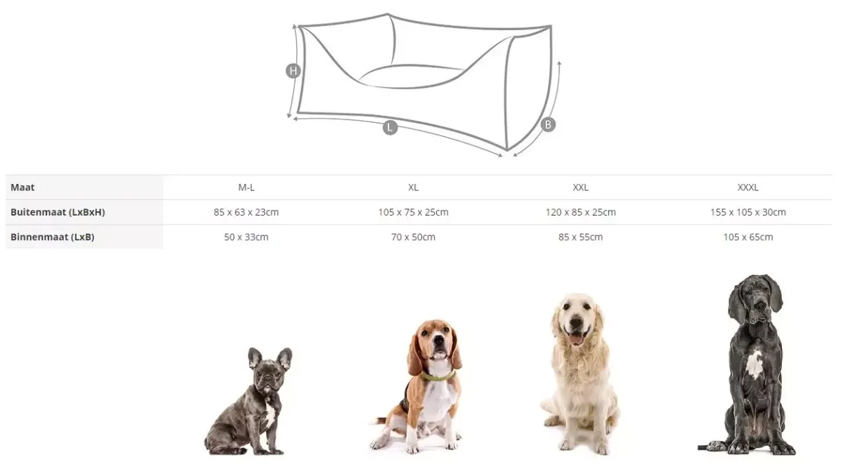 Het Lotte-bed is verkrijgbaar in verschillende maten, waardoor het geschikt is voor kleine, middelgrote en grotere honden. Dankzij de veerkrachtige vulling en stevige constructie kunnen honden van uiteenlopende gewichten comfortabel gebruik maken van dit bed. Of je nu een kleine huishond hebt of een middelgrote hond die graag languit ligt — het Lotte-bed biedt overal voldoende ruimte en comfort.