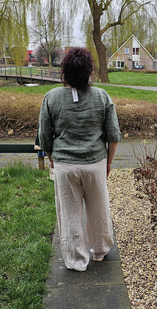 Comfortabele en luchtige linnen broek. Met handige steekzaken met knopjes en elastische talie band. De pijpen zijn versmalt met plooien onder in. Lijkt heel sierlijk.