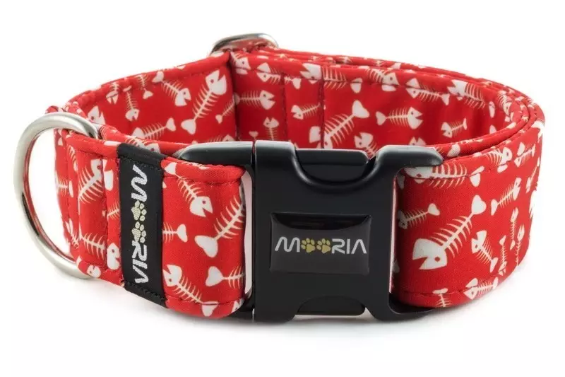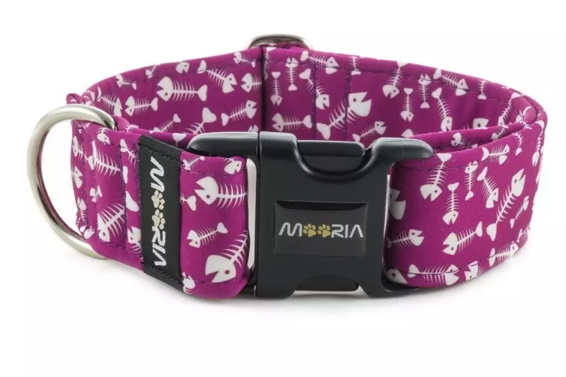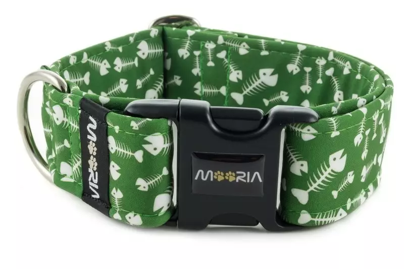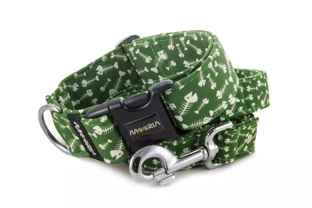 MOORIA Original Halsband Fishbone. De MOORIA halsbanden en lijnen zijn gemaakt van functionele waterdichte stoffen. De basis is gemaakt van zwaar nylonweefsel dat bedekt is met bedrukte of monochrome softshell-stof.