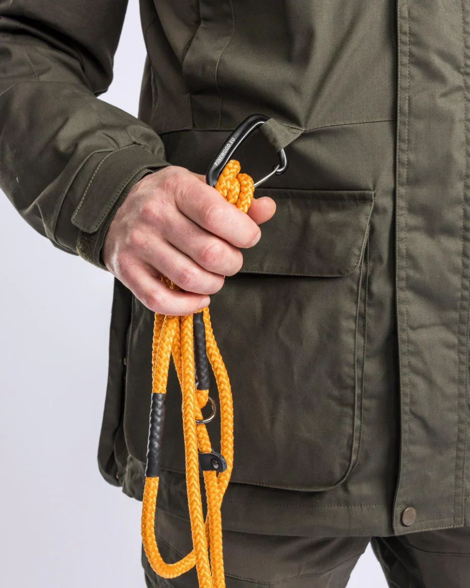 De PINEWOOD Dog Sports Trainer Jacket Men ritst dicht en heeft een windflap met verborgen drukknopen voor een veilige sluiting. Het is aan de onderkant verstelbaar met een verborgen trekkoord en bevat een D-ring en karabijnhaak in de taille voor het bevestigen van riemen of soortgelijke items.