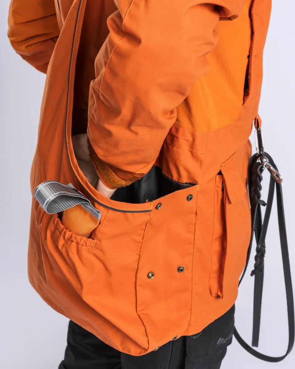 Aan de voorkant van de jas vind je twee steekzakken met magnetische sluitingen, zodat de zakkleppen aan de jas kunnen worden bevestigd voor snelle toegang tot traktaties of uitrusting.