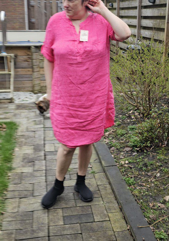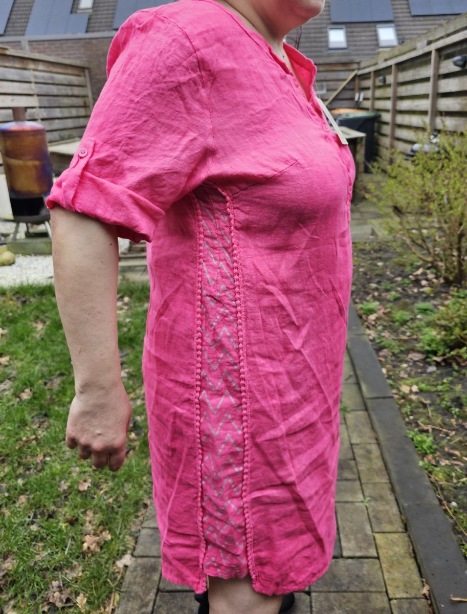Prachtige jurk in linnen met korte opgerolde mouwen. V-hals met knoppen en aan zijkant is een leuke band met wat glitters er in. Elegante maat toch heerlijk voor dagelijks gebruik